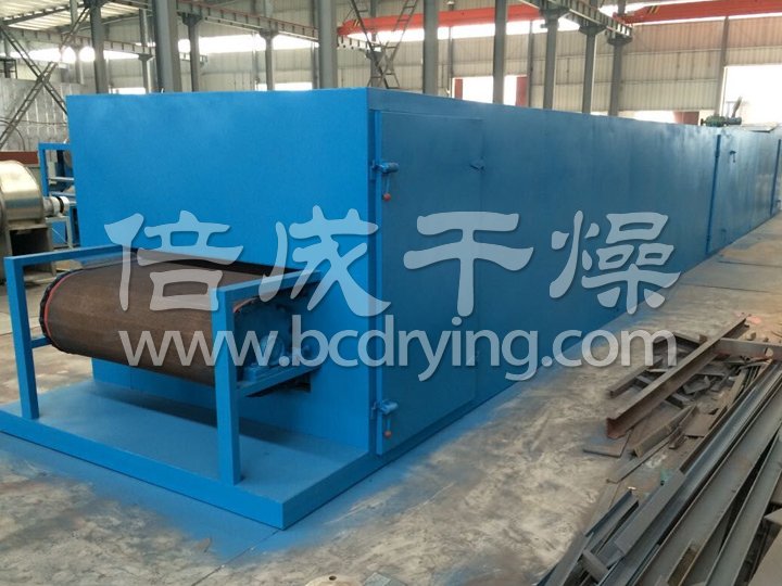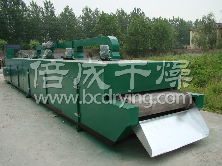 物料由加料器均勻地鋪在網(wǎng)帶上,網(wǎng)帶一般采用12-60目不銹鋼絲網(wǎng),由傳動(dòng)裝置拖動(dòng)在干燥機內移動(dòng)。干燥機由若干單元組成,每一單元熱風(fēng)獨立循環(huán),部分尾氣由專(zhuān)門(mén)排濕風(fēng)機排出,廢氣由調節閥控制,熱氣由下往上或由上往下穿過(guò)鋪滿(mǎn)物料的網(wǎng)帶完成熱量與質(zhì)量傳遞的進(jìn)程,帶走物料水份。網(wǎng)帶緩慢移動(dòng),運行速度可根據物料溫度自由調節,干燥后的成品連續落入收料器中。上下循環(huán)單元根據用戶(hù)需要可靈活配備,單元數量亦可根據需要選取。