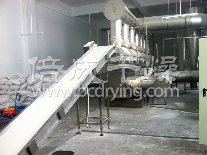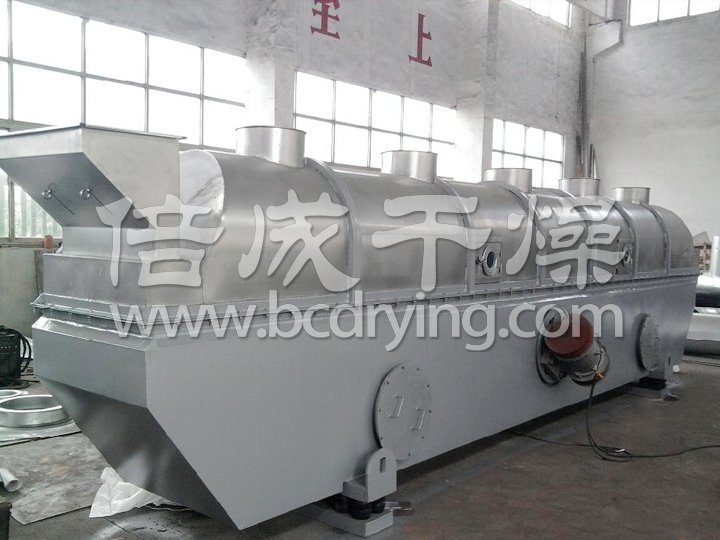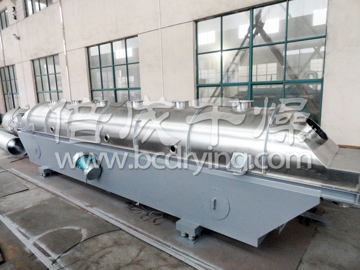 物料自進(jìn)料進(jìn)口進(jìn)入機內,在振動(dòng)力作用下,物料沿水平面流化床拋擲,向前連續運動(dòng),熱風(fēng)向上穿過(guò)流化床同濕物料換熱后,濕空氣經(jīng)旋風(fēng)分離器除塵后由排風(fēng)1:3排出.干燥物料由排料進(jìn)口排出。