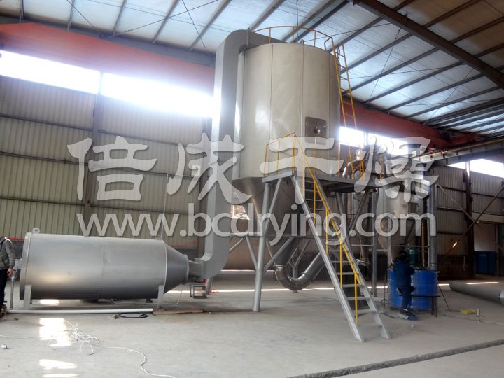 空氣經(jīng)過(guò)濾和加熱,進(jìn)入干燥器頂部空氣分配器,熱空氣呈螺旋狀均勻地進(jìn)入干燥室。料液經(jīng)塔體頂部的高速離心霧化器,(旋轉)噴霧成極細微的霧狀液珠,與熱空氣并流接觸在極短的時(shí)間內可干燥為成品。成品連續地由干燥塔底部和旋風(fēng)分離器中輸出,廢氣由風(fēng)機排空。