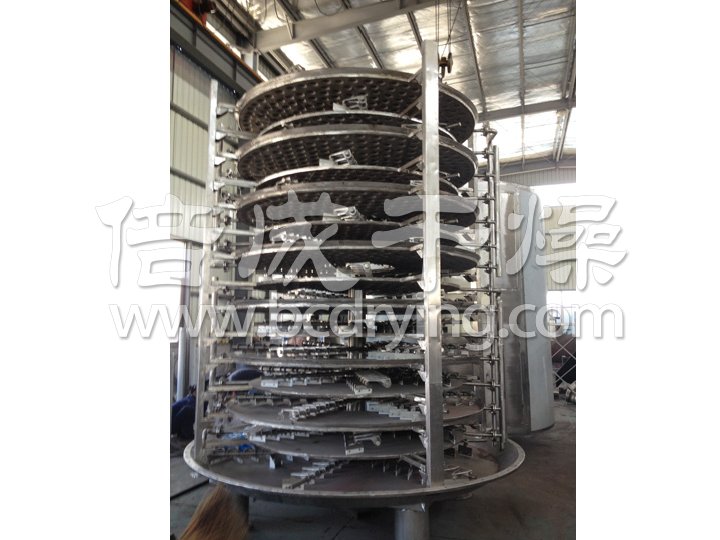濕物料自加料器連續地加到干燥器上部第一層干燥盤(pán)上,帶有耙葉的耙臂作回轉運動(dòng)使耙臂作回轉運動(dòng)使耙葉連續地翻抄物料。物料沿指數螺旋線(xiàn)流過(guò)干燥盤(pán)表面,在小干燥盤(pán)上的物料被移送到外緣,并在外緣落到下方的大干燥盤(pán)外緣,在大干盤(pán)上物料向里移動(dòng)并從中間落料口落如下一層小干燥盤(pán)中。大小干燥盤(pán)上下交替排列,物料得以連續地流過(guò)整個(gè)干燥器。中空的干燥盤(pán)內通入加熱介質(zhì),加熱介質(zhì)形式有飽和蒸汽、熱水和導熱油,加熱介質(zhì)由干燥盤(pán)的一端進(jìn)入,從另一端導出。已干物料從后一層干燥盤(pán)落到殼體的底層,然后被耙葉移送到出料口排出。濕份從物料中逸出,由設在頂蓋上的排濕口排出,真空型盤(pán)式干燥器的濕氣由設在頂蓋上的真空泵口排出。從底層排出的干物料可直接包裝。通過(guò)配加翅片加熱器、溶劑回收冷凝器、袋式除塵器、干料返混機構、引風(fēng)機等輔機,可提高其干燥的生產(chǎn)能力,干燥膏糊狀和熱敏性物 料,可方便地回收溶劑,并能進(jìn)行熱解和反應操作。